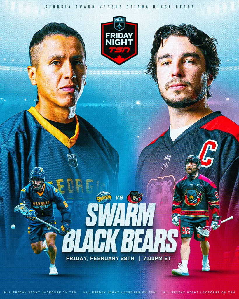 Tune in tonight at 7:00pm ET for NLL Friday Night on TSN as the Georgia Swarm take on the Ottawa Black Bears. Watch on TSN, TSN+, ESPN+, & NLL+.