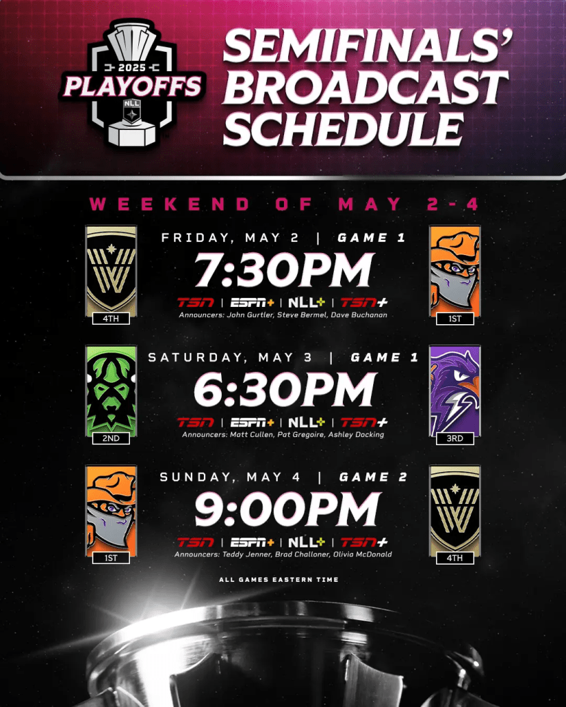 All games are available to stream on TSN, ESPN+, NLL+, & TSN+.